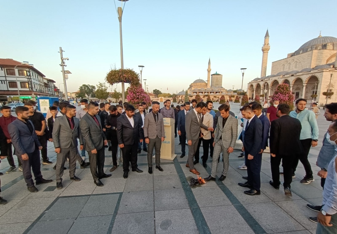 Konya Ülkü Ocakları İl Başkanı Yusuf Kasım Akta ve beraberindeki Ülkü Ocakları mensupları daha sonra Mevlana Türbesi önünde bir basın açıklaması yaptılar.